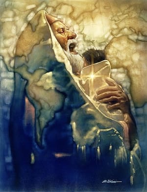 This image is not only about Simeon. It is not only about Mary and Joseph. It is about the Father embracing all humanity in Christ. (Notice the continents portrayed in the Simeon’s robe and the painting’s backgroud) Since Christmas, I’ve been waking early each morning, holding this reality. Sometimes quite literally—I take a pillow in my arms and let my body feel what my soul is discovering.